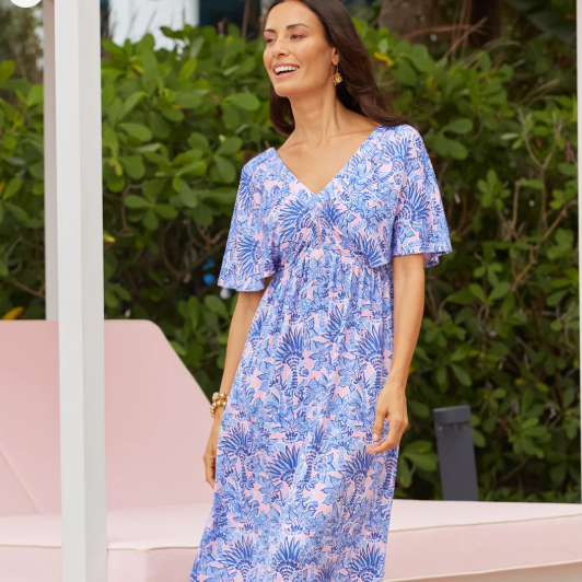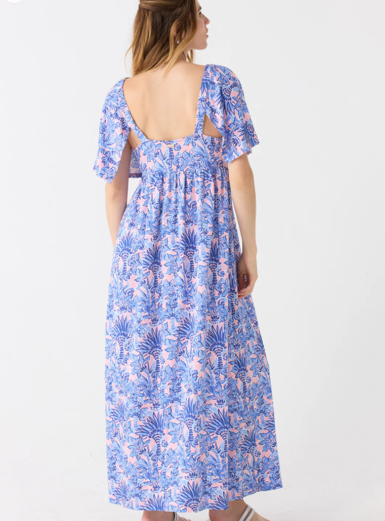 Sun safety to the MAX! The Palm Beach Flutter Sleeve Maxi Dress has a comfortable textured fabric with the highest-rated UPF 50+ protection. The blue and pink palm print is accented with a pink open detail along the bust. This flowy dress is designed to move with you – fitted at the top with a v-neckline that flares out. The flutter sleeves and open back add a flirty detail! The comfortable gauze UPF 50+ fabric makes it perfect for looking & feeling great on vacation!
