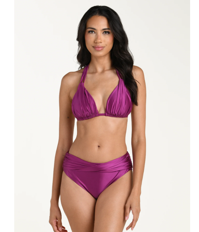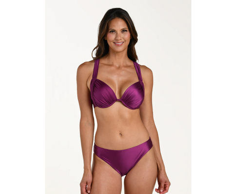 Draped Underwire Bikini- This fabric exudes a luxurious high-shine berry color, creating a sophisticated and flattering look. A seductive sweetheart neckline with molded cups lifts and separates with comfortable underwire support.