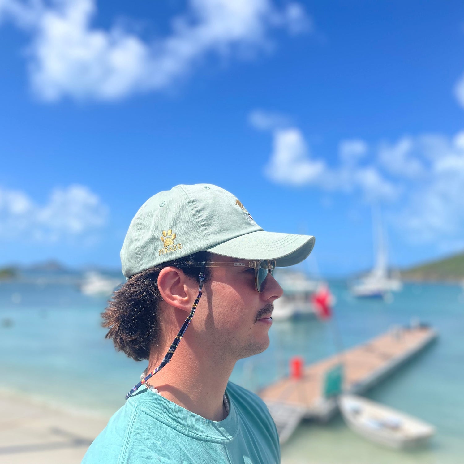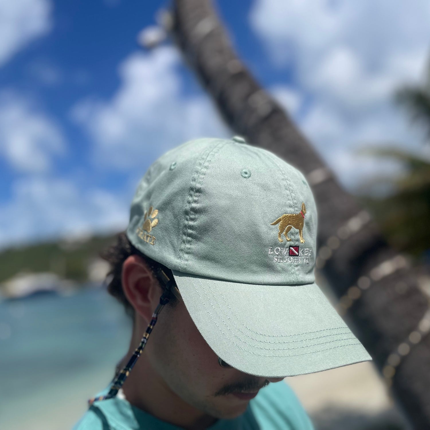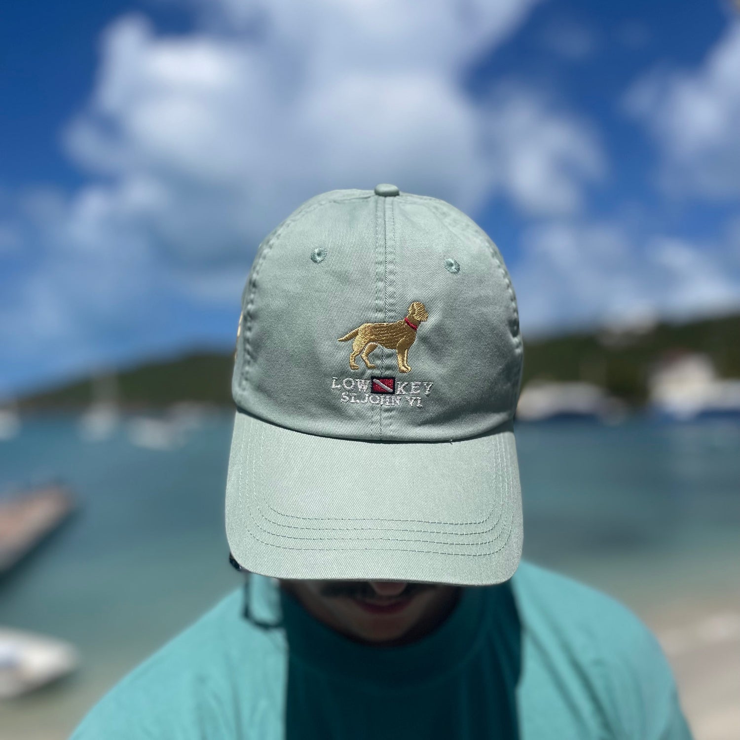 Classic fit Hat by Ahead. Unstructured in light weight cotton, has a pull Velcro closure for a great fit. Right side embroidered gold paw print and Pirate. Gold embroidered dog, Low Key St John VI on front. Four great colors to choose from.